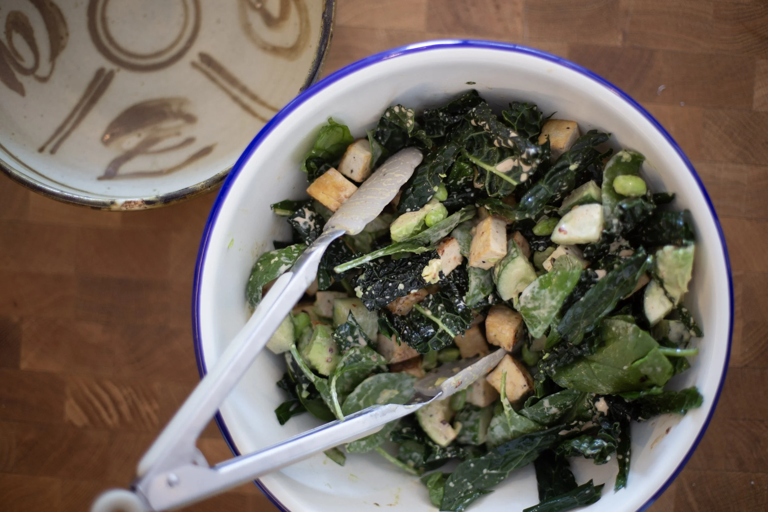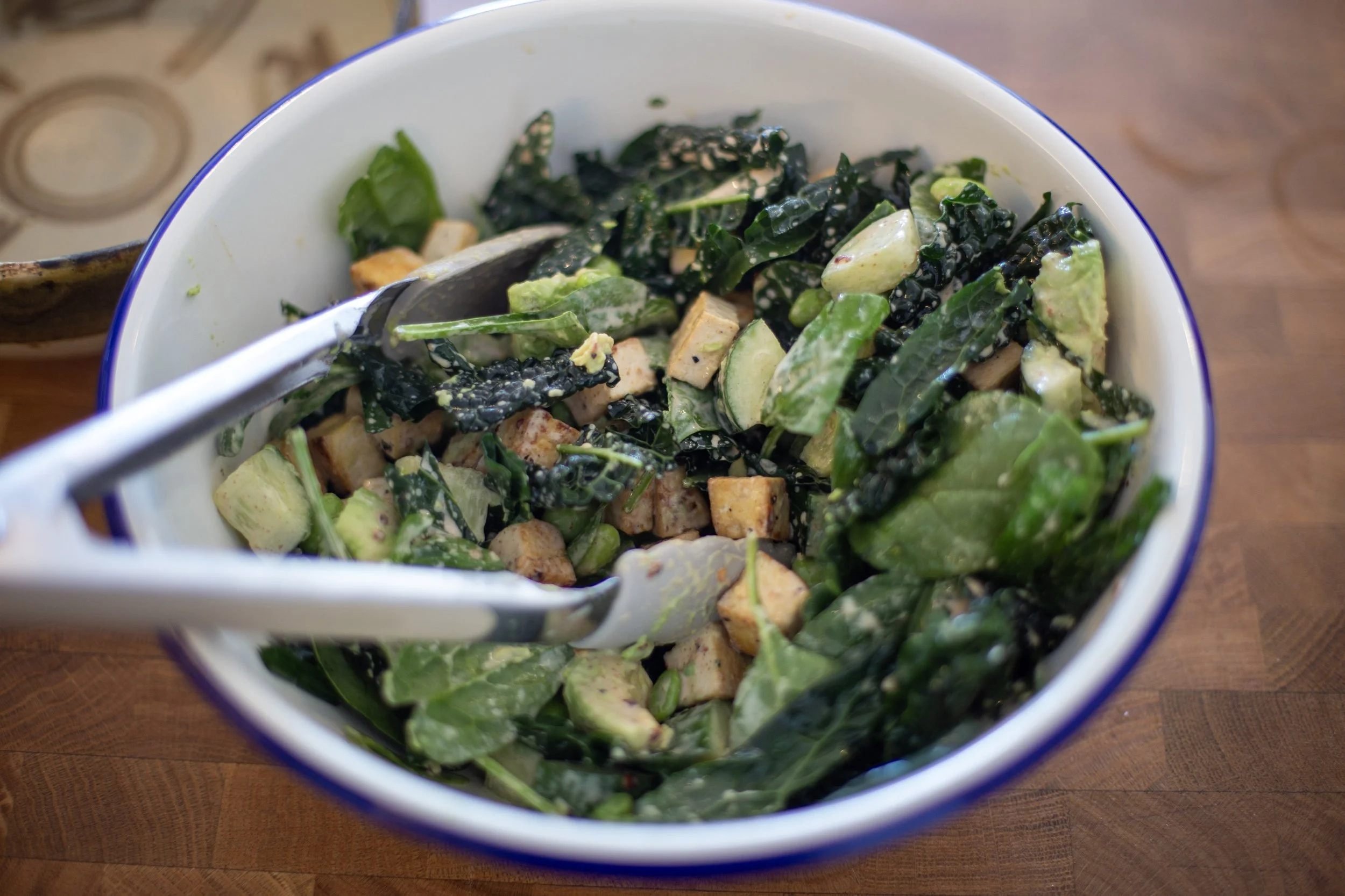 Add the spinach, edamame, cucumber, avocado and tofu. Toss gently. Then add in the chilli almond dressing. Toss until all ingredients are covered.